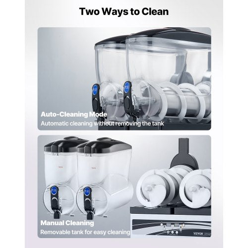 2 Tanks, unabhängige Einstellungen: Mit zwei 15-Liter-Tanks kann dieser Slush-Maker ca. 120 Tassen Slush-Getränke pro Charge herstellen. Sie können jeden Tank separat verwenden. Er muss seltener nachgefüllt werden und eignet sich daher ideal für den gewerblichen Einsatz mit hohem Publikumsverkehr. Der transparente Tank präsentiert farbenfrohe Getränke und eignet sich daher perfekt für Eisdielen, Burger-Restaurants, Cafés, Bars und andere gewerbliche Umgebungen.