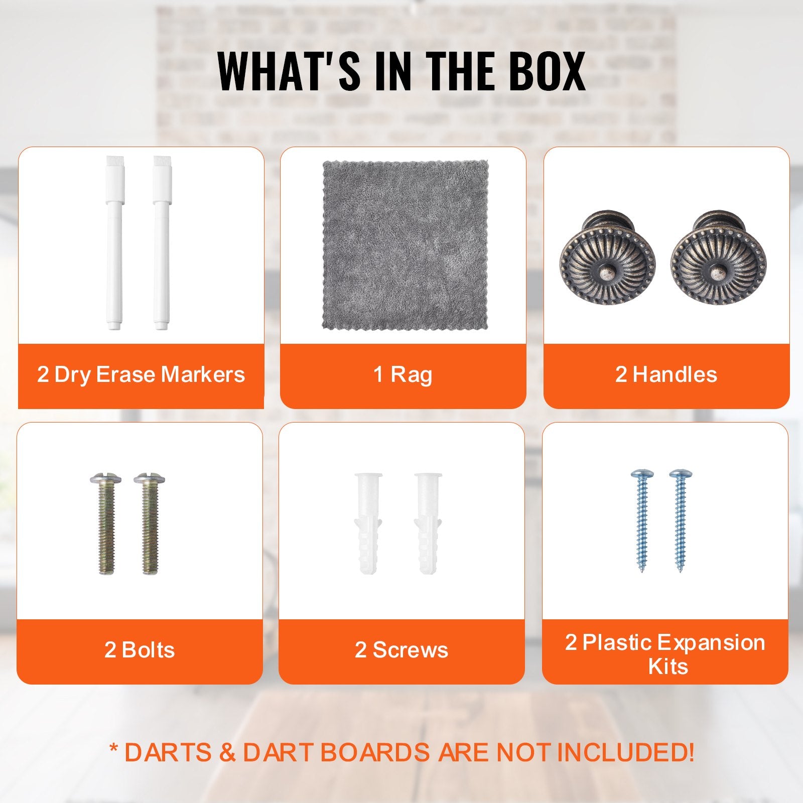 Mitgeliefertes Zubehör: Das Dart-Schrank wird mit dem wichtigsten Zubehör für den Einstieg geliefert: 2 trockene Reihenmarkierungen, 1 Reinigungstuch, 2 Griffe, 2 Bolzen, 2 Schrauben und 2 Kunststoff-Erweiterungskits. Hinweis: Darts und Dartscheibe NICHT IM LIEFERUMFANG ENTHALTEN!
