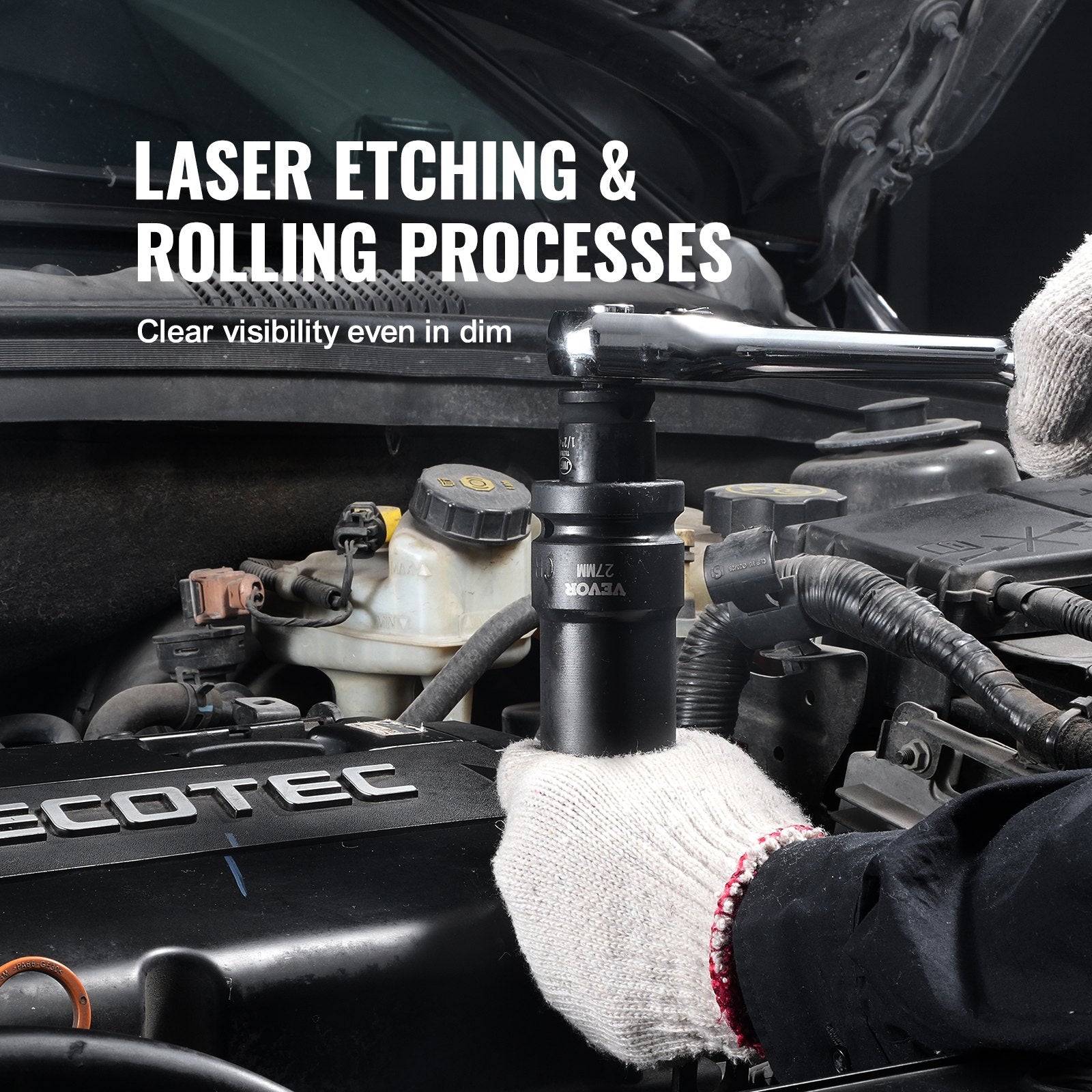 Hohes Drehmoment: Dieser Steckschlüsselsatz zeichnet sich durch seinen Sechskantantrieb aus, der ihn von herkömmlichen Ausführungen ohne abgerundete Ecken unterscheidet. Er reduziert den Druck, der beim Aufprall auf die Befestigungselemente ausgeübt wird, erheblich. Dadurch wird der Verschleiß minimiert und das Abrunden und Überdrehen der Schrauben effektiv verhindert.