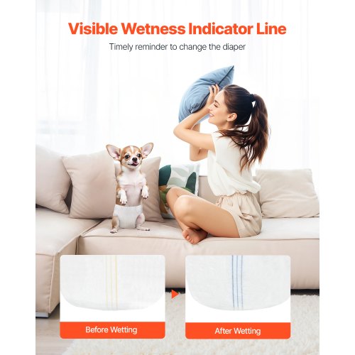 Nässeanzeige: Unsere VEVOR Einweg-Hundewindeln verfügen über eine intuitive Nässeanzeige, die den Zustand vor und nach dem Einnässen deutlich anzeigt. Im trockenen Zustand bleibt die Linie normal, im nassen Zustand verändert sie sich jedoch sofort und zeigt Ihnen an, wann es Zeit für einen Wechsel ist, damit Ihr Haustier trocken und komfortabel bleibt.