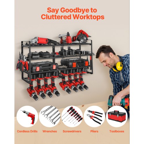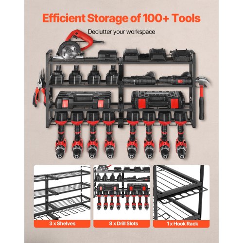 Väggmonterad verktygsorganisatör, 4-lagers förvaringsställ med 8 borrhållare, verktygshållare och förvaringsställ med skruvmejselhållare, verktygsorganisatör för garage, arbetsbänk och verkstad | EU