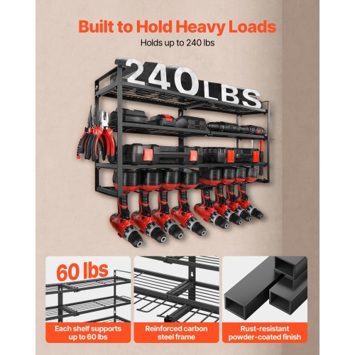 Stark och hållbar: Tillverkad av premiumkolstål, stöder detta förvaringsställ för elverktyg totalt 240 lbs (60 lbs per våning). Pulverlackerad för rostskydd, med näthyllor för luftflöde och värmeavledning