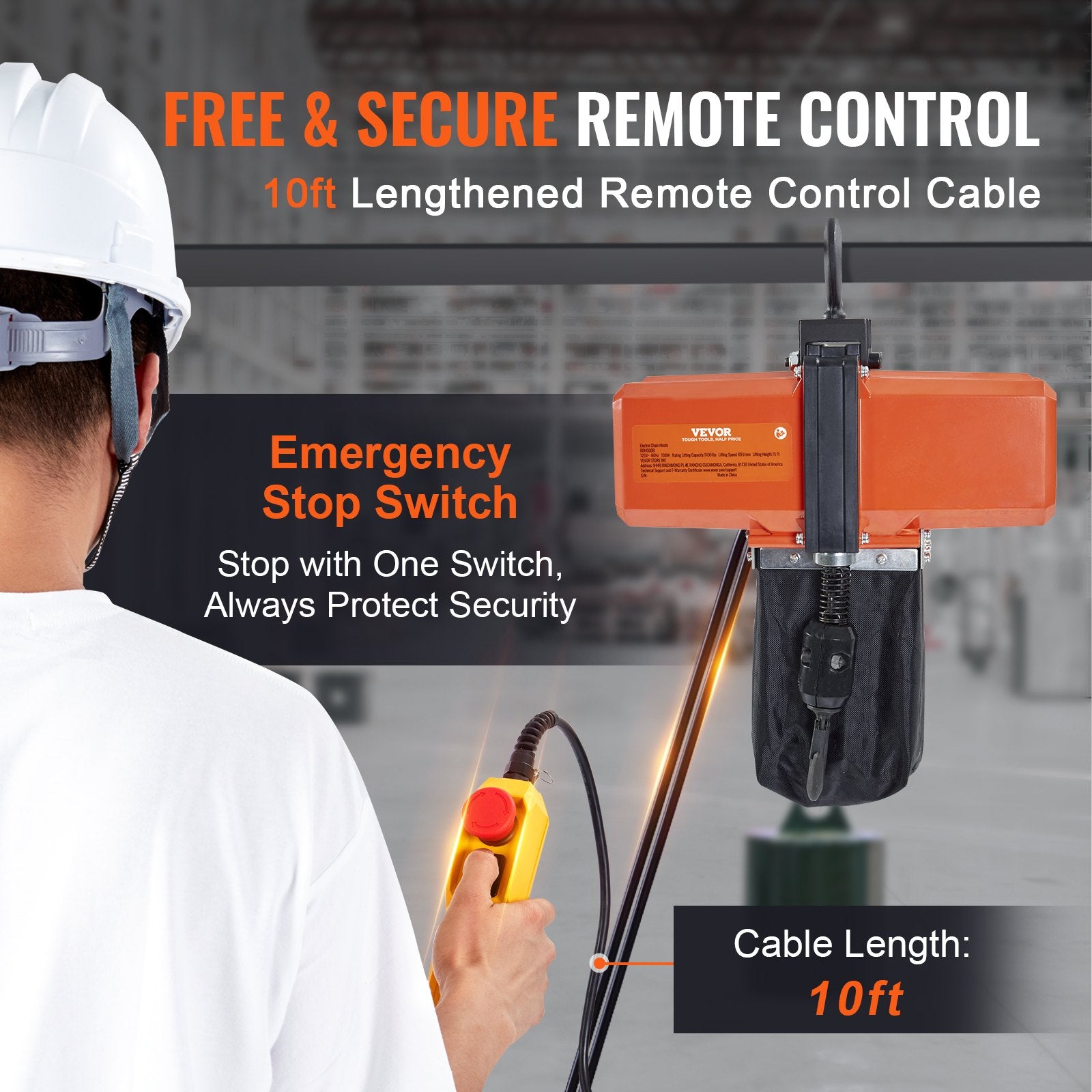 Verlängertes Steuerkabel: Die kabelgebundene Fernbedienung unseres Elektrokettenzugs erfolgt über den an der Maschine montierten Griffschalter mit Kabel. Die Länge des verlängerten Kabels beträgt 3 m, sodass Sie in sicherer Entfernung arbeiten können.