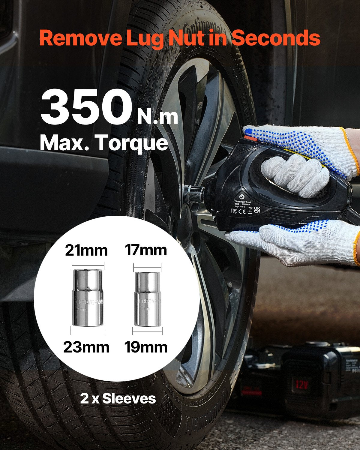 Leistungsstarker Elektroschrauber: Mit einem maximalen Drehmoment von 350 Nm löst oder zieht dieser Elektroschrauber Schrauben in Sekundenschnelle an. Enthält 2 Sechskant-Steckschlüssel, kompatibel mit 4 Schraubengrößen (17/19 mm und 21/23 mm), passend für die meisten Radmuttern.