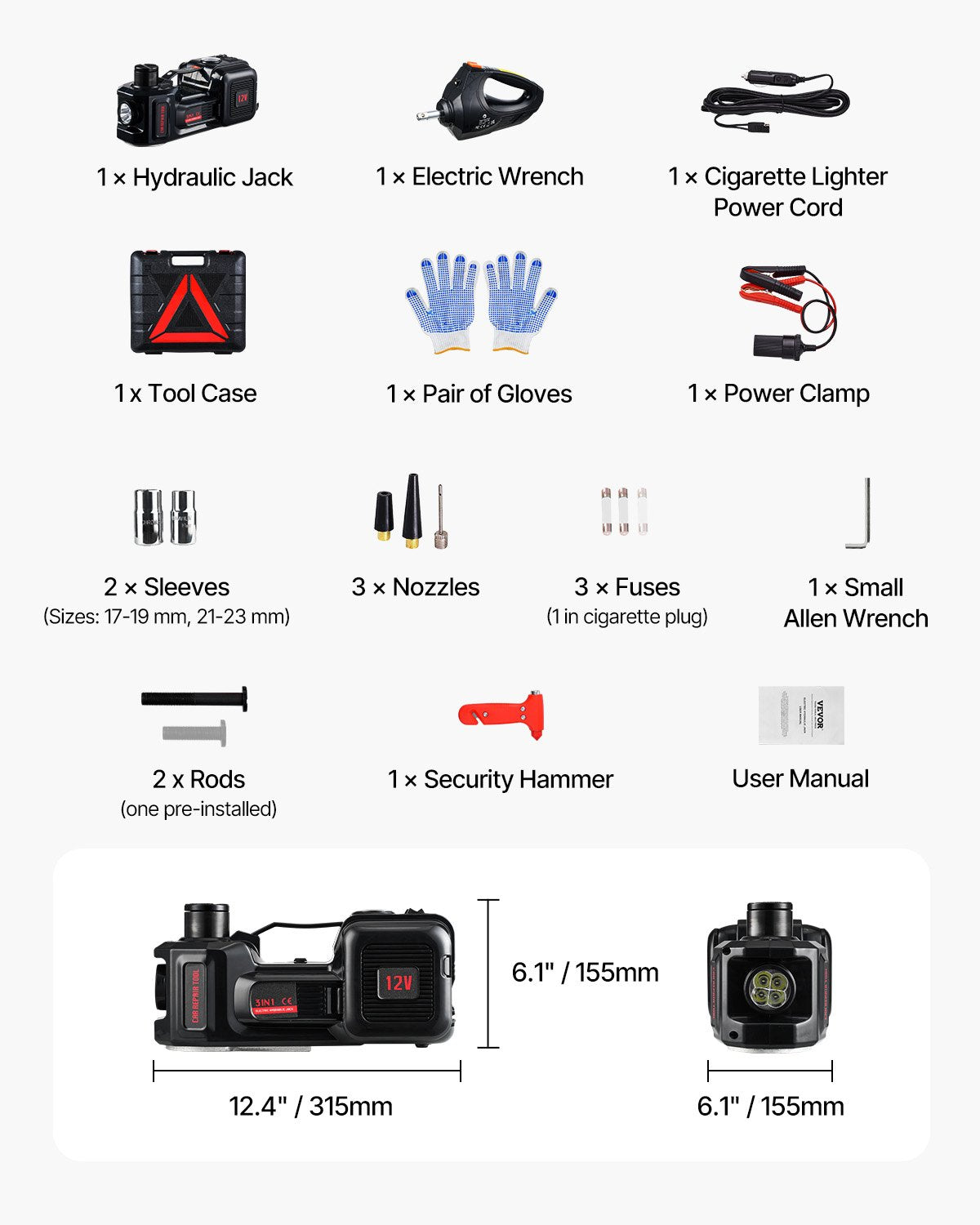 Doppelte Stromversorgung: Ausgestattet mit einem Zigarettenanzünder und einer 12-V-Autostromklemme für flexible Stromversorgungsoptionen. Für Fahrzeuge über 5 Tonnen empfehlen wir die Nutzung der Fahrzeugstromversorgung, um ein stabiles Heben zu gewährleisten. 2 Ersatzsicherungen sind im Lieferumfang enthalten, um einen Sicherungsausfall zu vermeiden.