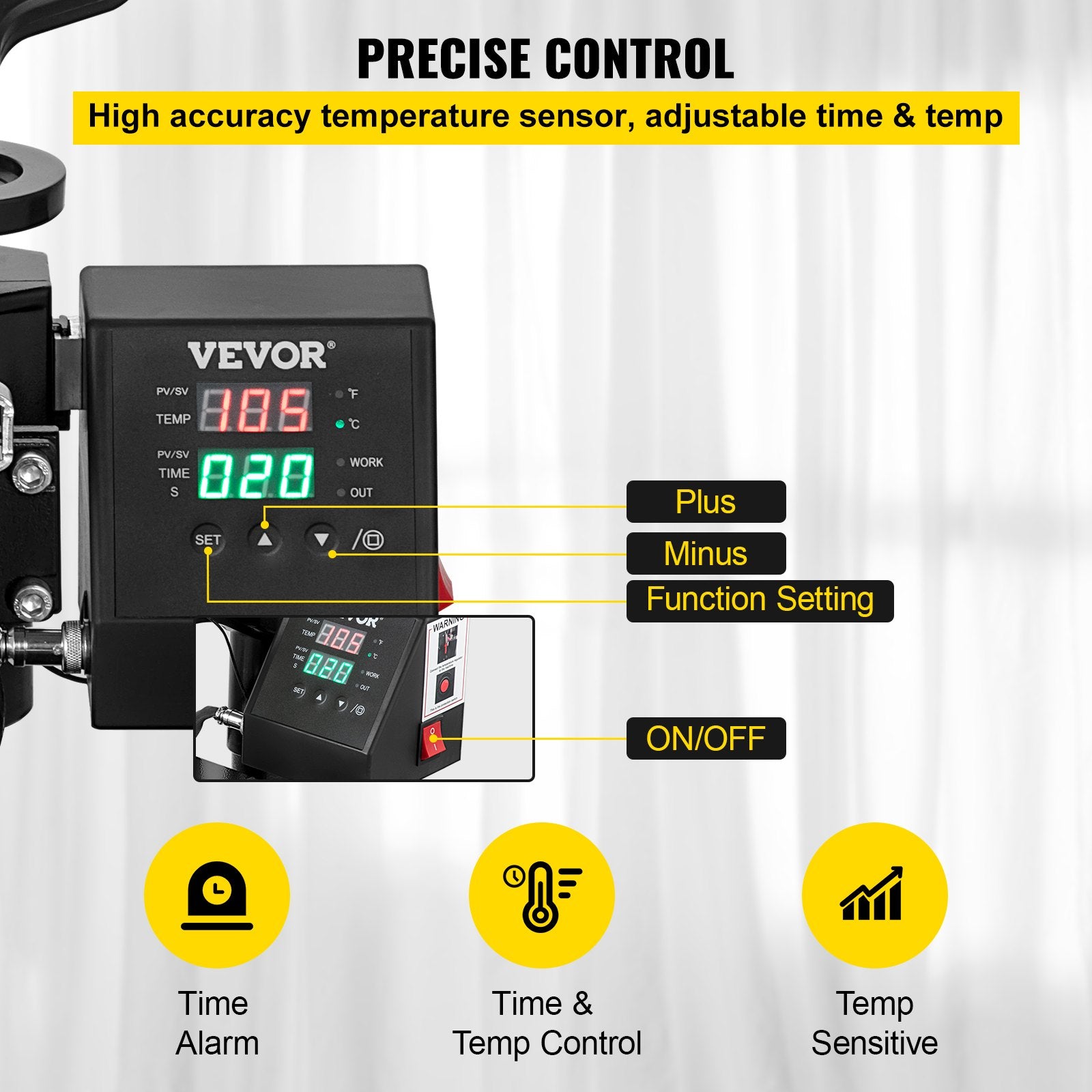 Digitales Bedienfeld: Diese Transferpresse ist mit einem präzisen Bedienfeld ausgestattet, mit dem Sie Temperatur und Zeit präzise steuern können. Nach dem Aufheizen ertönt automatisch ein Alarm, der Sie daran erinnert, die Gegenstände zu entnehmen. Temperaturbereich: 0–250 °C; Zeiteinstellung: 0–999 Sekunden; Leistung: 650 W; Spannung: 220 V.