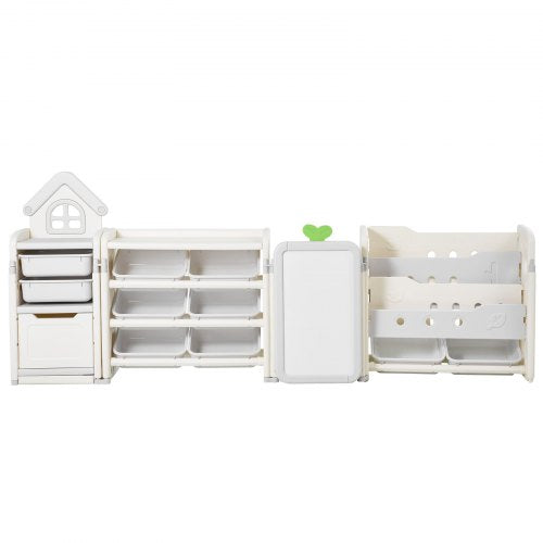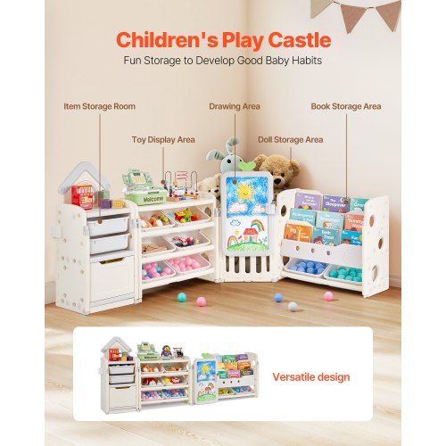 Multifunktionale Aufbewahrung: Dieser Kinderspielzeug-Organizer kombiniert einen Bereich zur Spielzeugpräsentation, einen Bücheraufbewahrungsbereich, einen Abstellraum, einen Zeichenbereich und einen Puppenaufbewahrungsbereich und bietet ausreichend Platz für Spielzeug, Bücher, Büromaterial, Bauklötze und mehr. Dank des geräumigen, unterteilten Designs sorgt er für Ordnung im Zimmer und lässt Kinder die Freude am Aufbewahren erleben.
