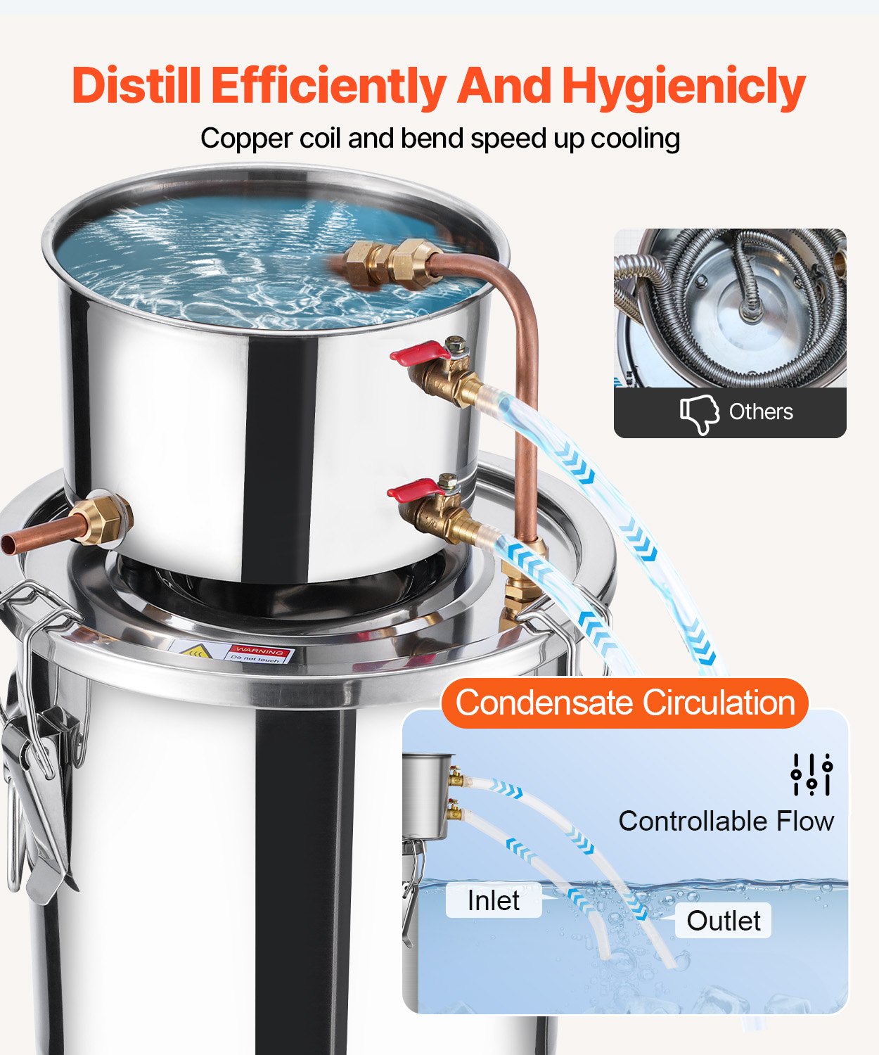 Kupferspiralkühlung: Der Kühl- und Destillationsprozess nutzt Kupferrohre mit guter Wärmeleitfähigkeit für eine effiziente Kühlung. Die glatte und faltenfreie Innenseite der Rohre verhindert Rückstände von destilliertem Alkohol und Wasser und sorgt so für einen geschmacksneutralen Nachgeschmack. Die Wassereinlass- und -auslassventile steuern Durchfluss und Kühlrate.