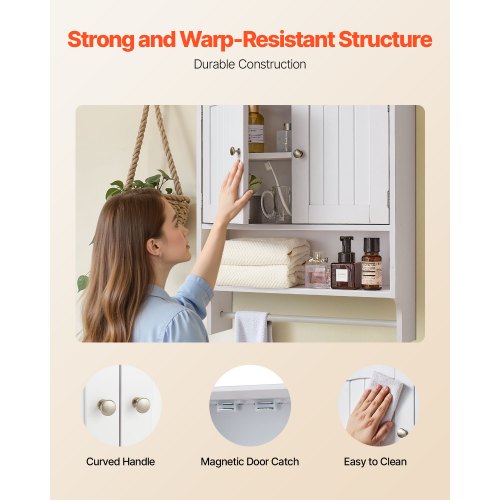 Badrumsskåp, 2 dörrar och justerbar hylla, Förvaring över toaletten Medicinskåp Väggmonterat, Hängande Organiserare med Öppen Skiljevägg och Handduksstång för Tvättstuga Kök, Vit | EU
