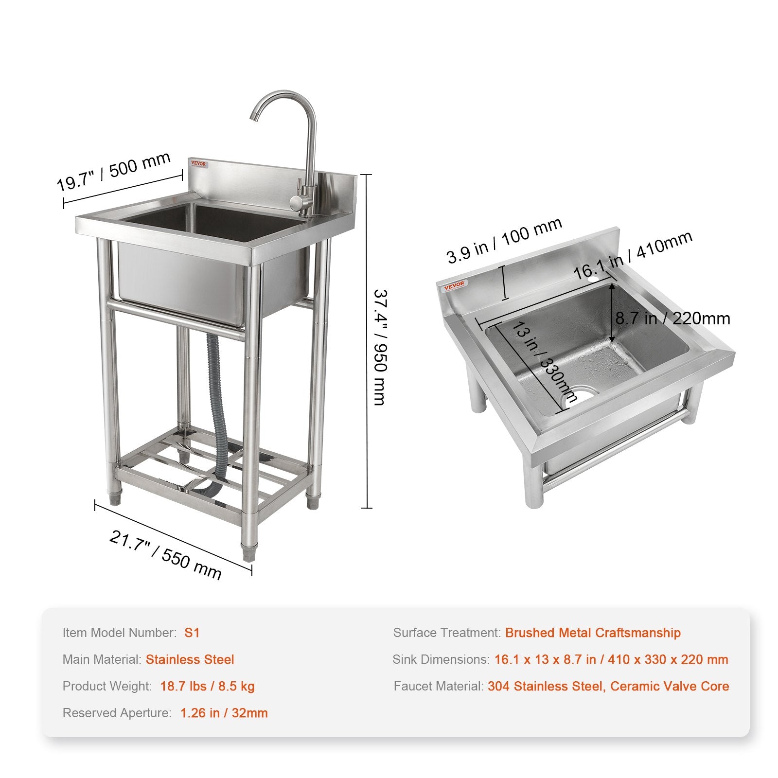 Edelstahlspüle, 1 Becken, freistehende kleine Spüle, inklusive Wasserhahn und Beinen, 16 x 13 x 8,7 Zoll, gewerbliche Spülen für Garage, Restaurant, Küche, Wäscherei, NSF-zertifiziert