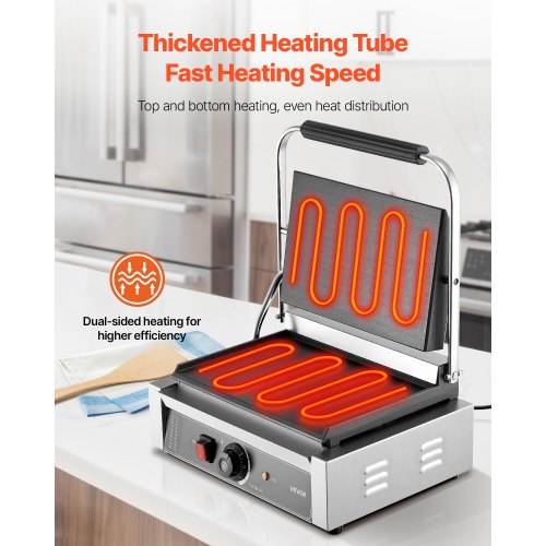 Jämn och snabb uppvärmning: Utrustad med förtjockade värmerör värmer den elektriska panini-maskinen den 34x23 cm stora tillagningsytan jämnt och effektivt. De övre och nedre gallren värms upp samtidigt, vilket säkerställer högeffektiv tillagning.