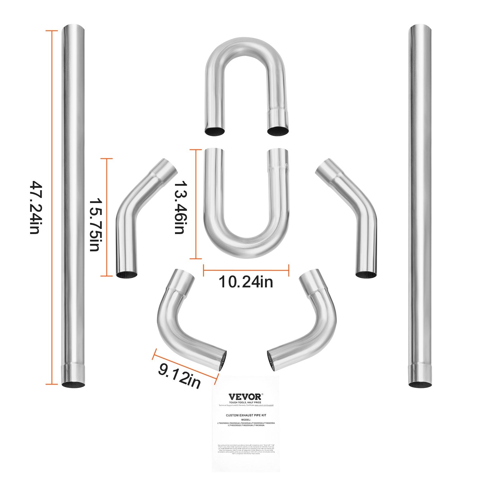 Komplettes Auspuff-Kit: Dieses Auspuff-Kit enthält insgesamt 8 Rohre mit einem Durchmesser von 2,5 Zoll, darunter 2 gerade Rohre, 2 90°-Rohre, 2 45°-Rohre und 2 U-förmige Rohre. Dieses Set bietet Ihnen die Flexibilität, Ihre Abgasanlage für maximale Effizienz individuell anzupassen.