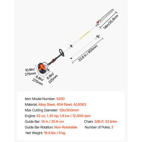 Verstärktes Design: Die Benzin-Hochentaster verfügt über eine verdickte, vertikale Stange aus Legierung, die Druck und Biegung widersteht, und die verstärkte Zugschnur sorgt für lange Haltbarkeit. Hergestellt aus rostbeständiger Aluminiumlegierung, ist sie für den Einsatz im Freien konzipiert. Die 3/8 LP-Stahlkette und die 14-Zoll-Schiene schneiden problemlos Äste mit einem Durchmesser von bis zu 12 Zoll.