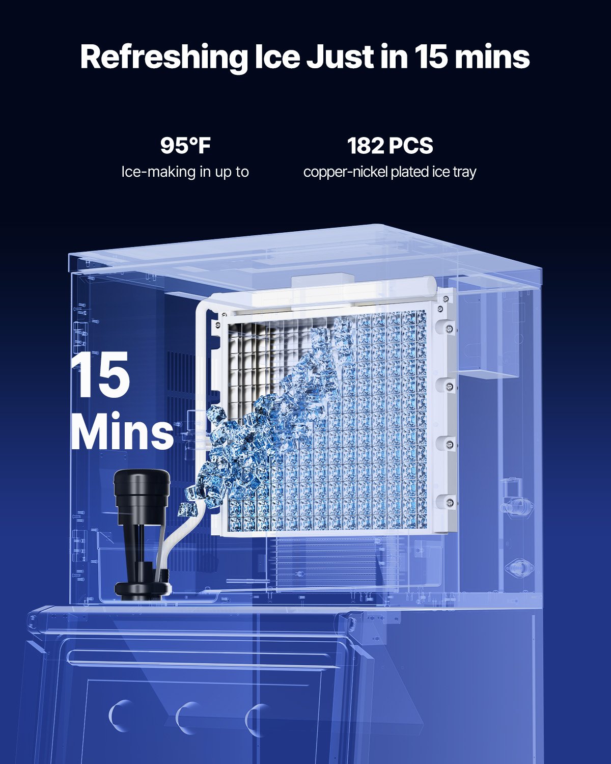 Schnelle Eisproduktion: Die gewerbliche Eismaschine ist mit 182 Eiswürfelbehältern ausgestattet. Sie können die Eisdicke anpassen, indem Sie die Eisproduktionszeit verlängern oder verkürzen. Der leistungsstarke Kompressor produziert Eiswürfel in nur 12–15 Minuten.