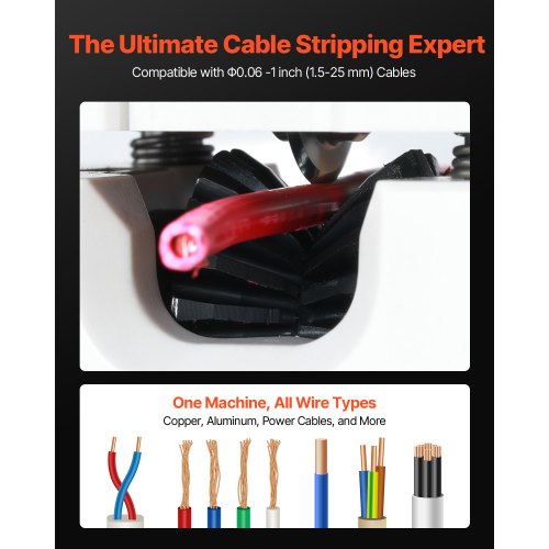 Bewältigt alle Kabeltypen: Diese Abisoliermaschine kann Kabel mit Durchmessern von 0,06 Zoll bis 1 Zoll verarbeiten und eignet sich zum Abisolieren von harten Kabeln, weichen Kabeln, mehradrigen Kabeln, einadrigen Kabeln und mehr.