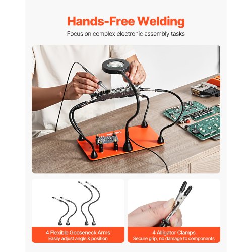 Freihändige Nutzung: Dieses Handwerkzeug verfügt über vier flexible Schwanenhalsarme und vier magnetische Säulenhalter, die empfindliche elektronische Komponenten sicher halten und Ihnen die Hände für Projekte jeder Größe frei lassen. Die Arme lassen sich um 360° biegen, um Winkel und Höhe einfach einzustellen.