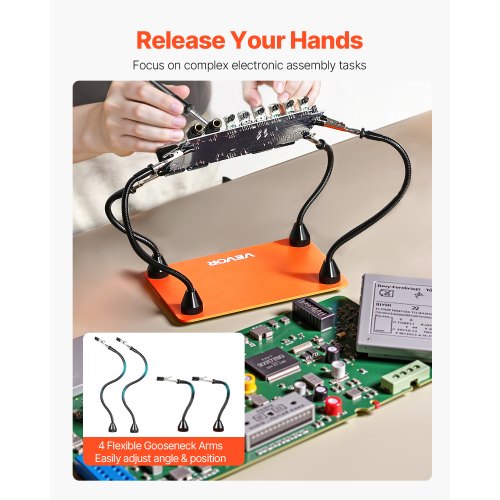 Freihändige Nutzung: Dieses praktische Handwerkzeug verfügt über vier flexible Schwanenhalsarme, die empfindliche elektronische Komponenten sicher halten und Ihre Hände für Projekte jeder Größe frei lassen. Die Arme lassen sich um 360° biegen, um Winkel und Höhe einfach einzustellen.
