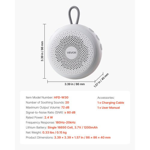 Lång batteritid: Denna bärbara vitbrusmaskin använder en bekväm USB-laddningsmetod, vilket gör att du kan ladda den när som helst och var som helst. Med en batterikapacitet på upp till 1200 mAh behöver du inte oroa dig för att få slut på ström och kan njuta av en god natts sömn utan avbrott.