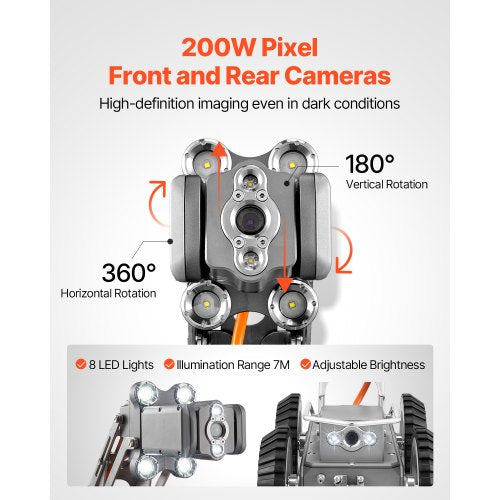 2MP-Doppelkameras: Der Raupenroboter für die Rohrleitungsinspektion verfügt über 2MP-HD-Kameras vorne und hinten, wobei die Frontkamera eine horizontale Drehung um 360° und eine vertikale Drehung um 180° unterstützt. Er verfügt außerdem über 8 einstellbare LEDs, die bei schwachem Licht von 0,01 Lux eine klare Sicht von bis zu 5–10 Metern ermöglichen.