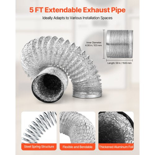 Flexibler Abluftschlauch: Der 1,5 Meter lange Schlauch verfügt über eine robuste Stahlfederkonstruktion und verdickte Aluminiumfolie. Mit einem Innendurchmesser von 10,6 cm ist er flexibel und robust, für verschiedene Installationsarten geeignet und sorgt für eine effektive Raumbelüftung.
