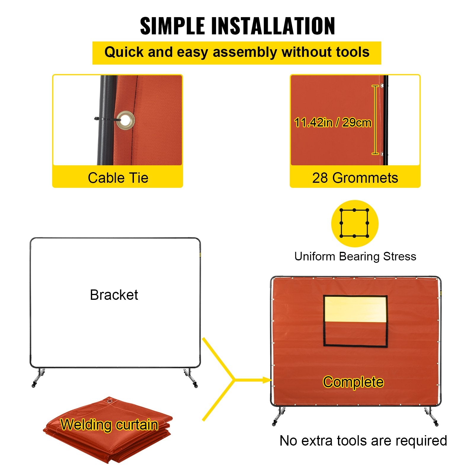 Einfache Montage: Die Steckverbindung und Kabelbinder ermöglichen eine schnelle und einfache Montage ohne Werkzeug. Für die Montage des Schweißschildes ist nur eine Person erforderlich.