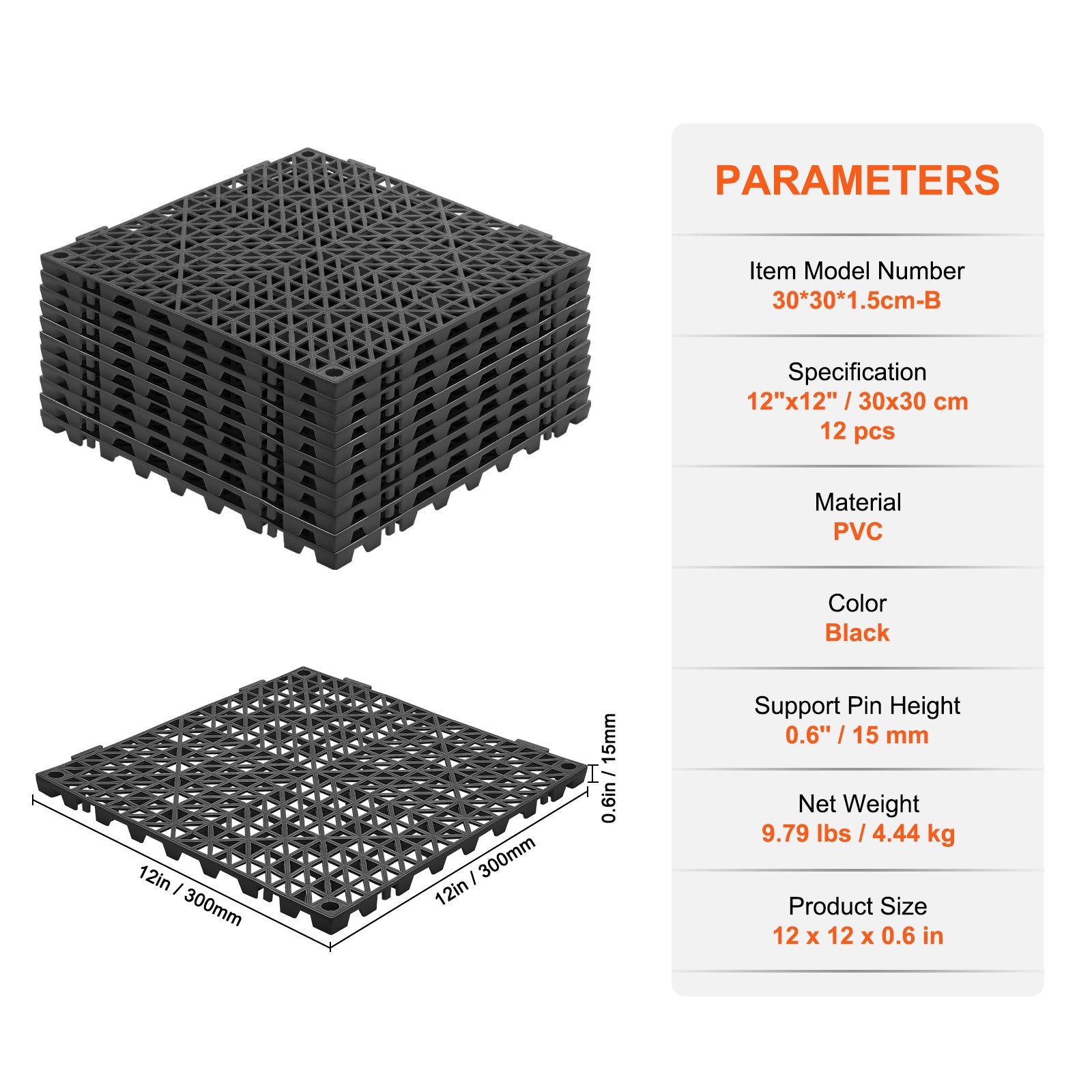 Ineinander greifende Drainage-Bodenmatte, 30,5 x 30,5 cm, rutschfeste PVC-Bodenfliesen, 12er-Pack