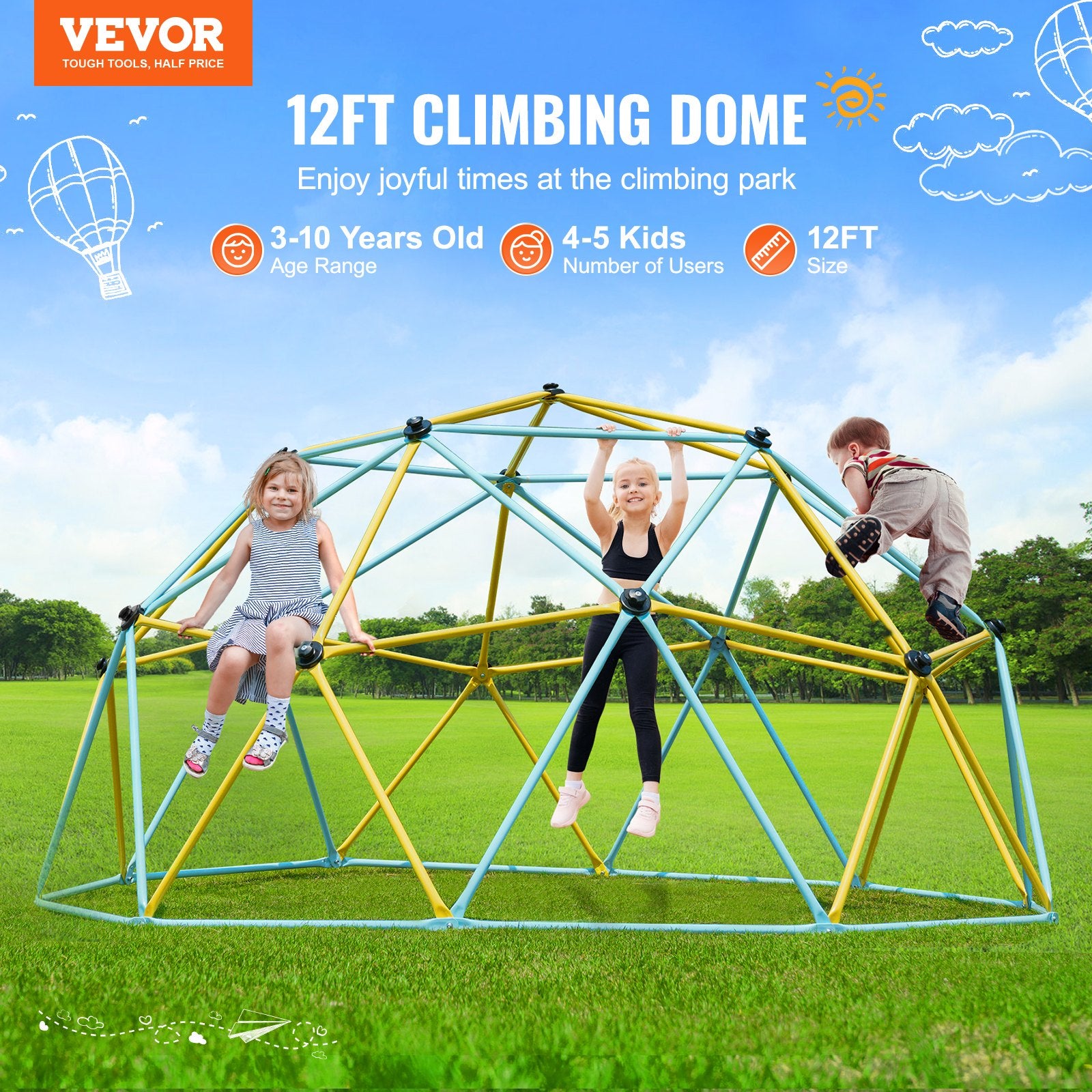 Kletterkuppel, 12 Fuß großes geometrisches Kuppel-Kletterspielzentrum für Kinder von 3 bis 10 Jahren, Klettergerüst trägt 750 Pfund und ist einfach zu montieren, mit Klettergriffen, Outdoor-Spielgerät für Kinder