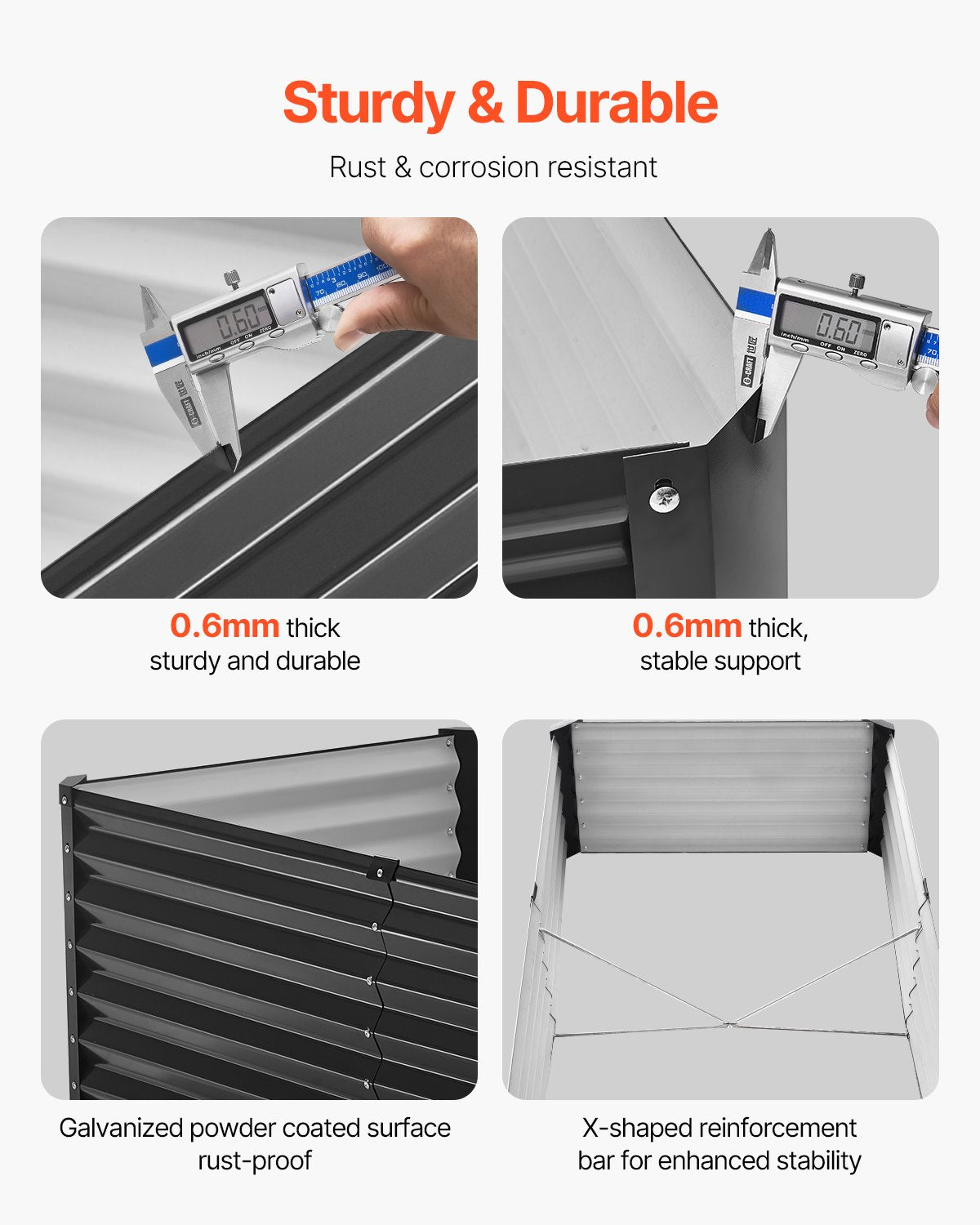 Robust und langlebig: Dieses Hochbeet aus Metall besteht aus 0,4 mm dicken Metallseitenteilen und 0,6 mm dicken Metalleckverbindungsplatten. Die Oberfläche ist pulverbeschichtet und somit rost- und korrosionsbeständig, was eine langfristige Nutzung im Außenbereich gewährleistet. Die vier internen X-förmigen Verstärkungsstäbe sorgen für zusätzliche Stabilität und verhindern ein Umkippen des Beets bei starkem Wind. Machen Sie sich bereit für den Outdoor-Einsatz!
