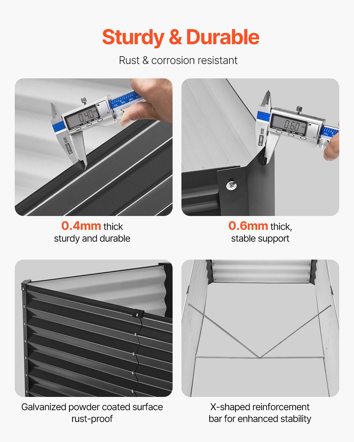 Robust und langlebig: Dieses Hochbeet aus Metall besteht aus 0,4 mm dicken Metallseitenteilen und 0,6 mm dicken Metalleckverbindungsplatten. Die Oberfläche ist pulverbeschichtet und somit rost- und korrosionsbeständig, was eine langfristige Nutzung im Außenbereich gewährleistet. Die vier internen X-förmigen Verstärkungsstäbe sorgen für zusätzliche Stabilität und verhindern ein Umkippen des Beets bei starkem Wind. Machen Sie sich bereit für den Outdoor-Einsatz!