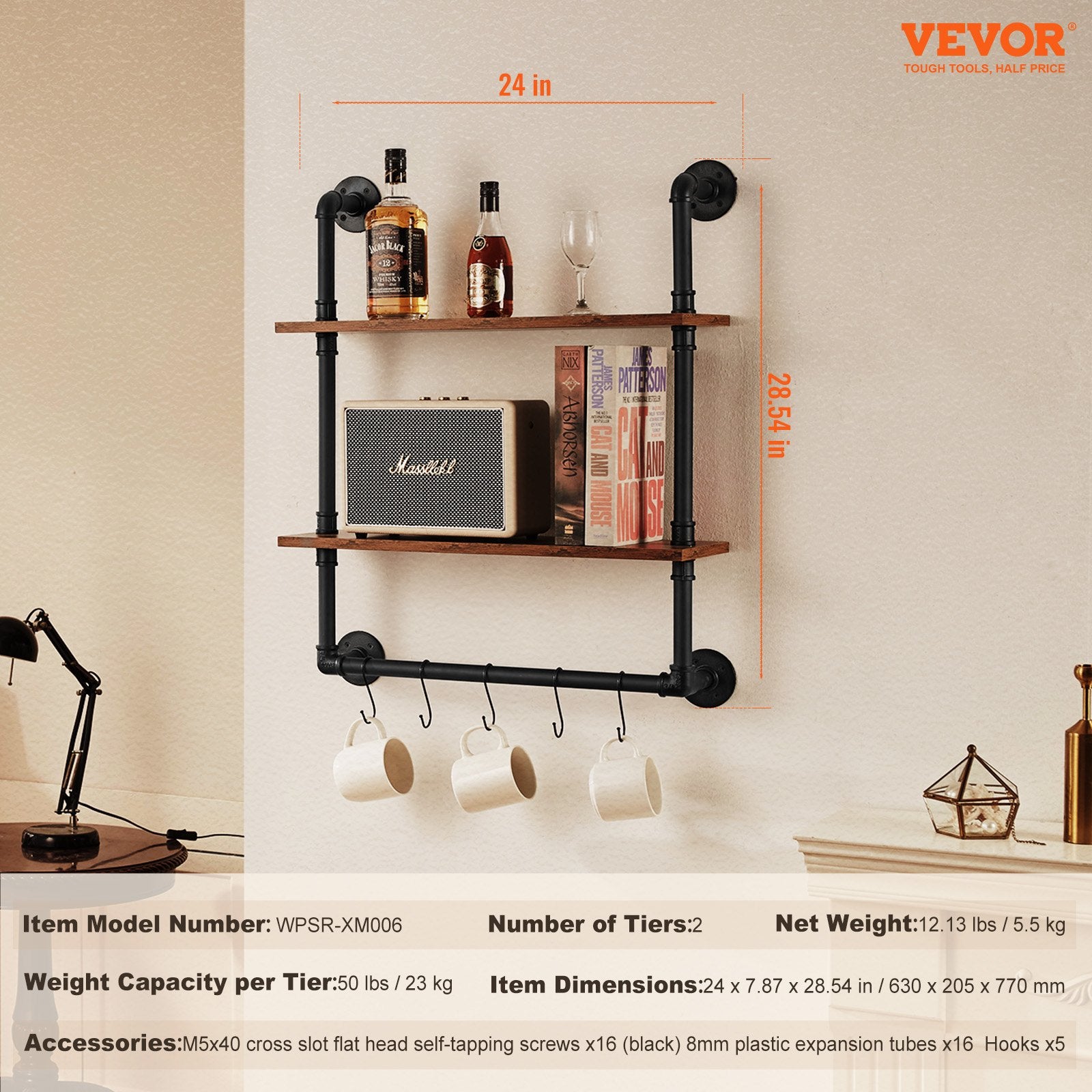 Industrielles Rohrregal, 2-stufig, 61 x 20 cm, Wandhalterung für Küche und Schlafzimmer