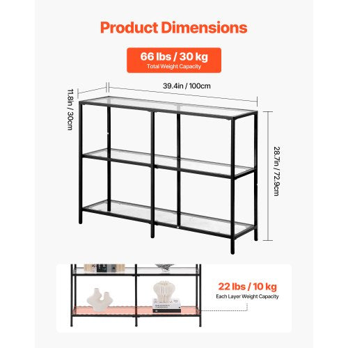 Stabil und zuverlässig: Der 1,6 cm dicke Eisenrahmen kann insgesamt bis zu 30 kg tragen, wobei jedes Regal bis zu 10 kg trägt. Der Konsolentisch ist langlebig gebaut und bietet zuverlässigen Halt für Bücher, Dekorationen und mehr.