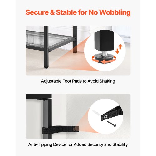 Durchdachte Details: Verstellbare Fußplatten sorgen für einen sicheren Stand des Tisches auf unebenen Böden, verhindern ein Wackeln und schützen Ihre Böden vor Kratzern. Für zusätzliche Sicherheit sorgt der Kippschutz – montieren Sie ihn unbedingt für zusätzliche Sicherheit.