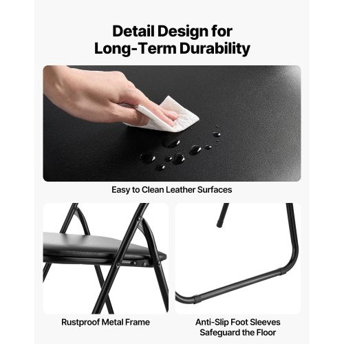 Hochwertiges Material: Unsere Klappstühle verfügen über einen hochwertigen Metallrahmen mit Rostschutzbehandlung, der lange Haltbarkeit und Oxidationsbeständigkeit gewährleistet. Rückenlehne und Sitzkissen bestehen aus PVC-Leder, das strapazierfähig, wasserdicht und leicht zu reinigen ist. Dank der stabilen Dreiecksstruktur kann er bis zu 158 kg tragen, während die rutschfesten Fußkappen die Stabilität erhöhen.
