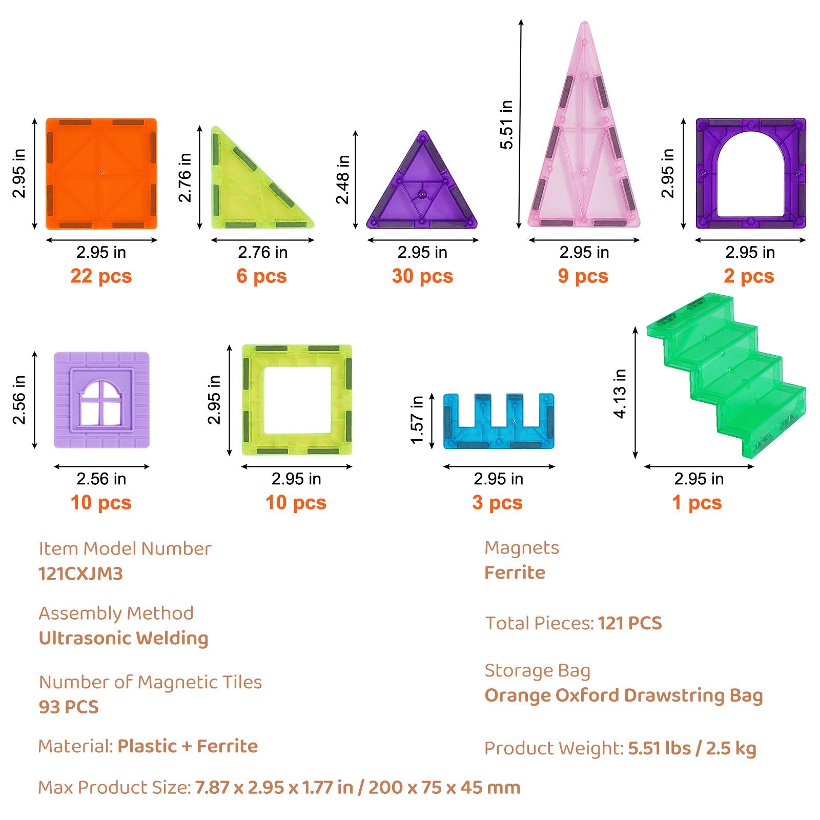 Mega-Pack mit 121 Teilen: Entfesseln Sie die Kreativität Ihres Kindes mit den magnetischen VEVOR-Plättchen! Dieses spannende Set enthält 121 magnetische Teile – 22 Quadrate, 6 rechtwinklige Dreiecke und 30 gleichseitige Dreiecke – perfekt für den Bau hoher, stabiler Strukturen, Gebäude und Burgen. Außerdem wird es mit einem praktischen Nylonbeutel mit Kordelzug für den einfachen Transport geliefert.