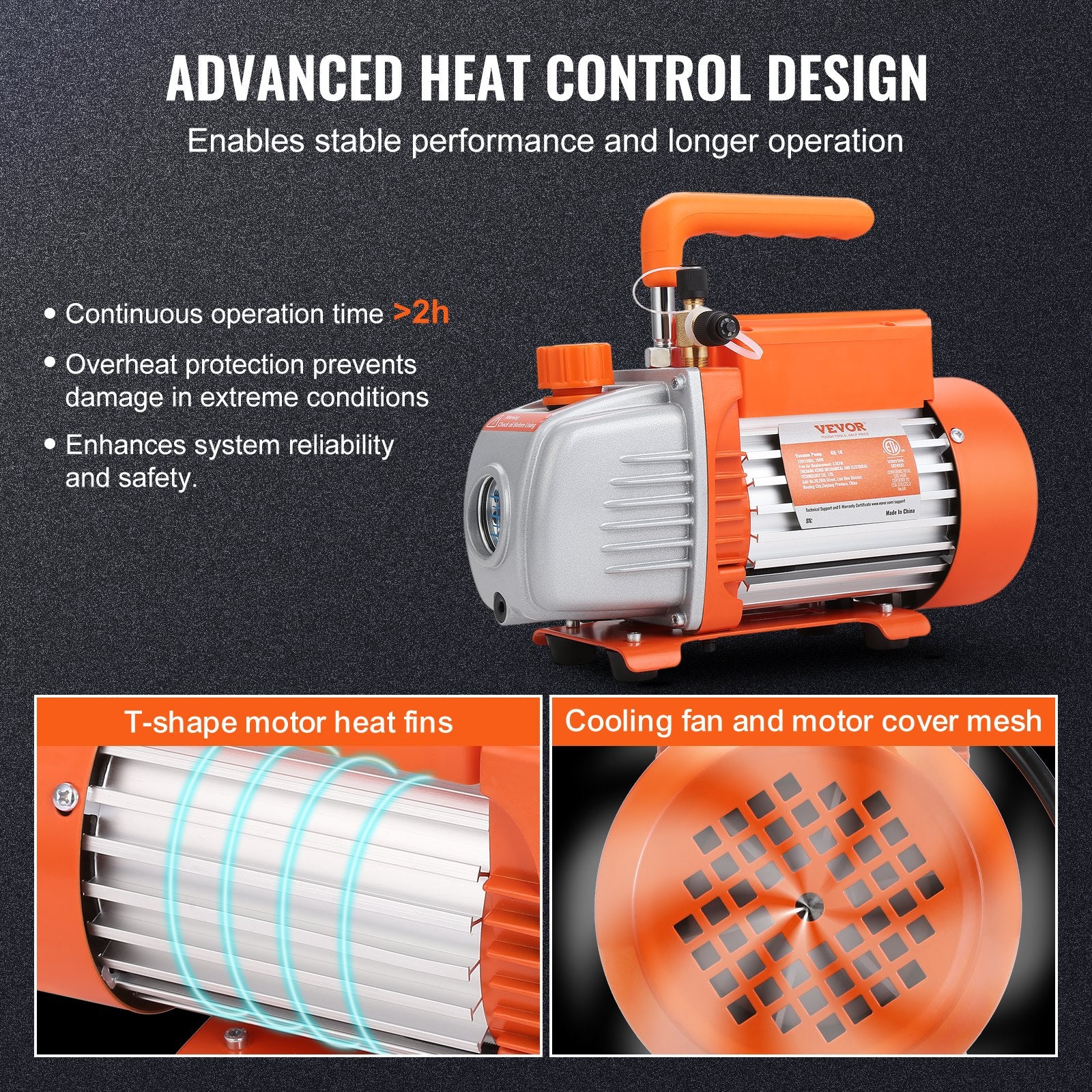 Der Hitze trotzen: Mit unserer innovativen einstufigen Vakuumpumpe gehören ständigen Ausfallzeiten der Vergangenheit an! Der T-förmige Kühlkörper und der Lüfter sorgen dafür, dass der Motor aus reinem Kupfer die Wärme effektiv ableitet und über 2 Stunden ununterbrochen läuft. Dank des zusätzlichen Überhitzungsschutzes profitieren Sie von stabiler Leistung und einer längeren Lebensdauer Ihres Motors.