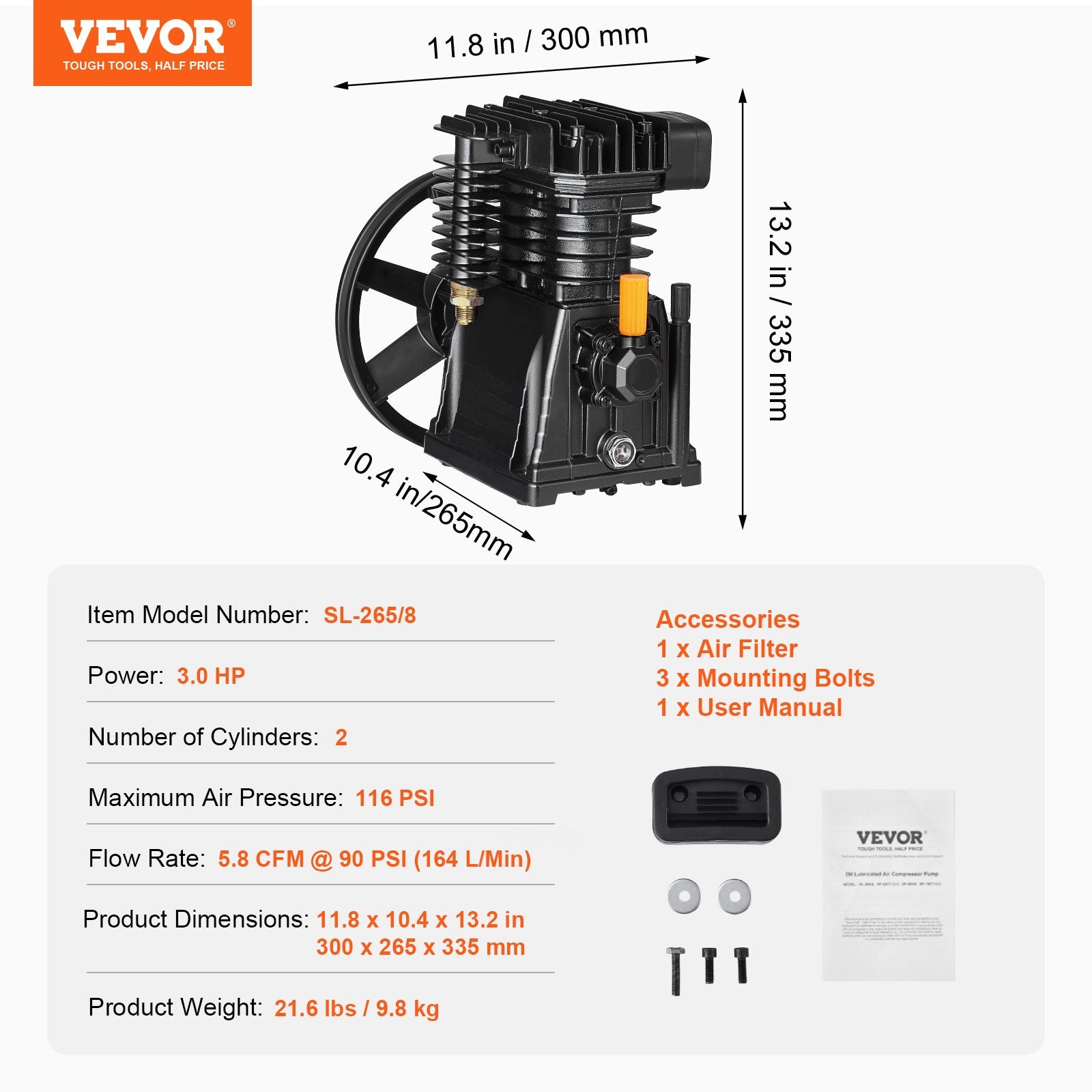 3-PS-Luftkompressor-Pumpenkopf: Der VEVOR 3-PS-Doppelzylinder-Luftkompressor-Pumpenkopf bietet eine Luftzufuhrrate von 5,8 CFM bei 90 PSI und einen maximalen Arbeitsdruck von 116 PSI und sorgt für eine kontinuierliche und ausreichende Luftversorgung für eine Vielzahl von Geräten, perfekt zum Reifenbefüllen, Lackieren, für die Holzbearbeitung und weitere Aufgaben. (HINWEIS: Motor nicht im Lieferumfang enthalten)