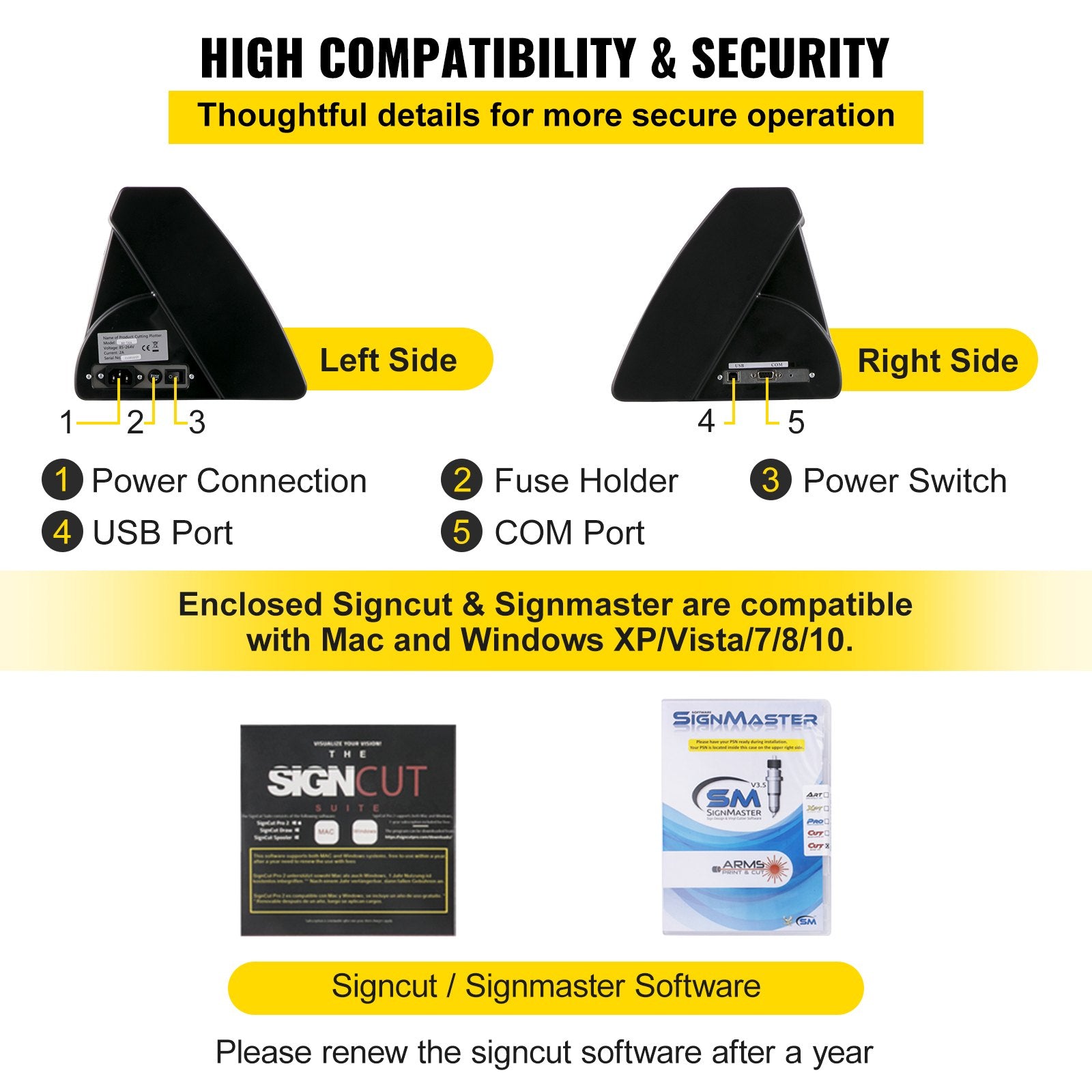 Vielseitige Kompatibilität: Dieser Vinyl-Plotter enthält die Signcut-Software mit USB-Schnittstelle und COM-Anschluss für eine einfachere Verbindung. Unterstützt mehrere Sprachen: DM/PL, HP/GL. Die Signmaster-Software unterstützt Windows XP/Vista/7/8/10/11 und die Signcut-Software unterstützt Mac-Systeme.