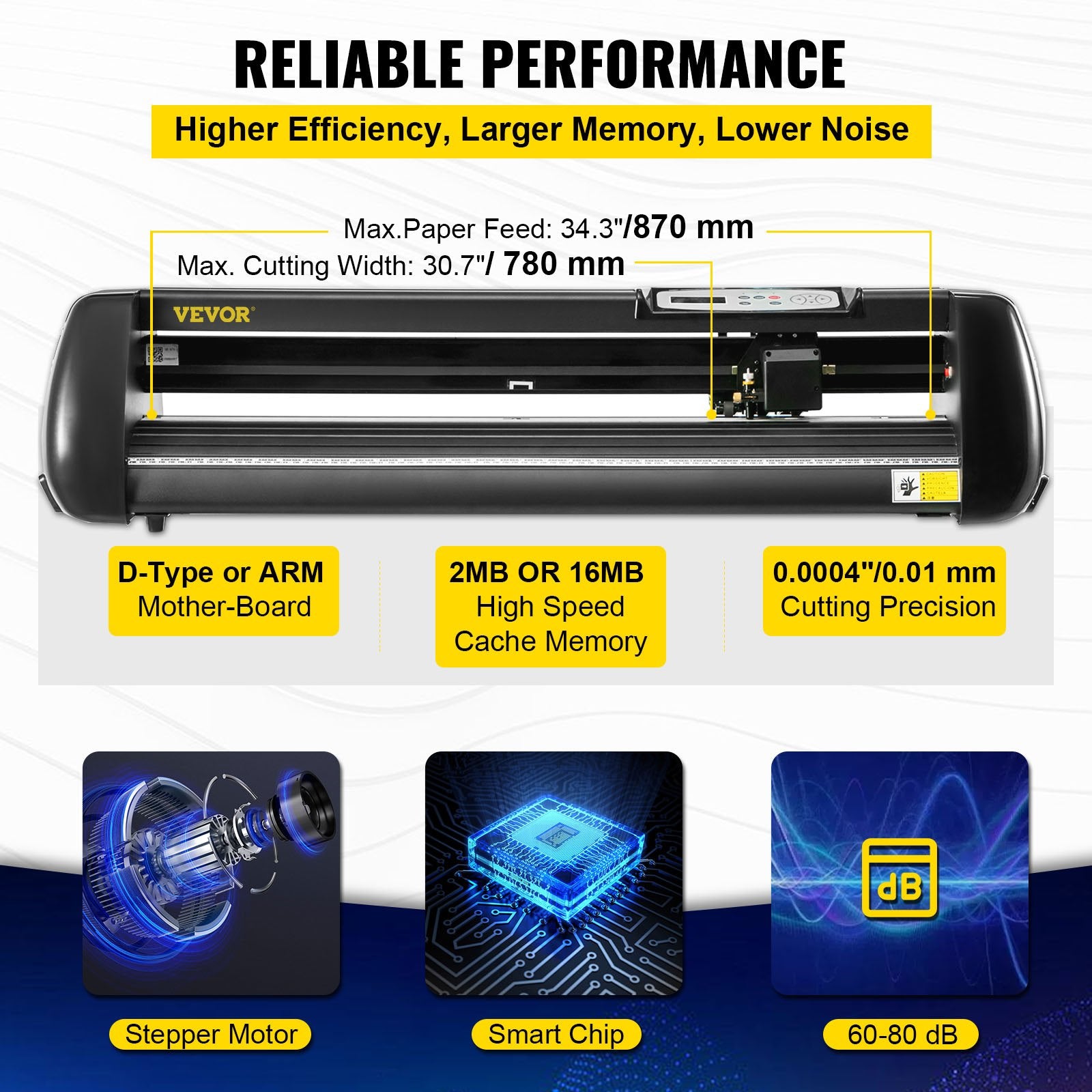 Zuverlässige Leistung: Max. Papierzufuhr: 870 mm; Max. Schnittbreite: 780 mm; Schnittstärke: 1 mm. Die intelligente Vinyl-Schneidemaschine ist für ihre robuste Leistung bekannt. Der schnelle und präzise Schrittmotor arbeitet effizient und geräuscharm. Das D-Type-Motherboard und der 2 MB High-Speed-Cache-Speicher ermöglichen langes Offline-Schneiden und unterstützen Ihre Datenspeicherung.