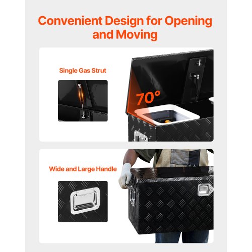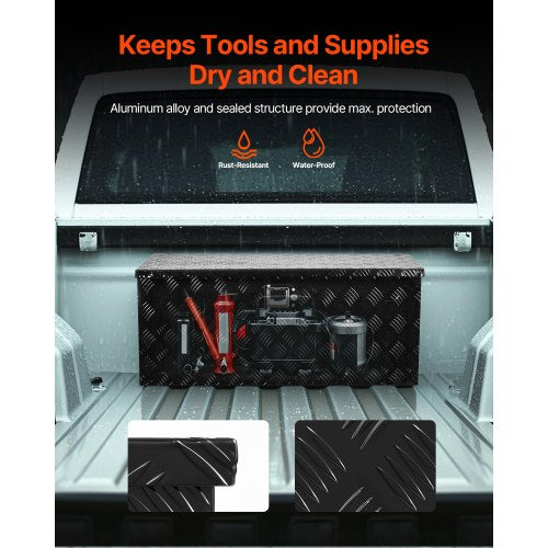 Robuste Aluminiumkonstruktion: Der Werkzeugkasten besteht aus einer hochwertigen, leichten und robusten Aluminiumlegierung mit gestreiftem Profil und Pulverbeschichtung für hervorragende Rostbeständigkeit. Er hält extremen Wetterbedingungen wie starkem Regen, Salznebel an der Küste und Schneeschmelze im Winter stand. Der dicht verschlossene Deckel verhindert das Eindringen von Regen und Staub und hält Ihre Werkzeuge im Inneren trocken.