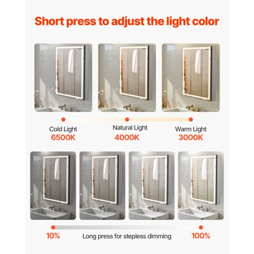 Helligkeit und 3 Farbtemperaturen: Unser beleuchteter Badezimmerspiegelschrank bietet stufenloses Dimmen und 3 Farbtemperaturen, perfekt zum Schminken oder für den Einsatz bei schwachem Licht in der Nacht. Er merkt sich außerdem automatisch die letzte Helligkeitseinstellung.