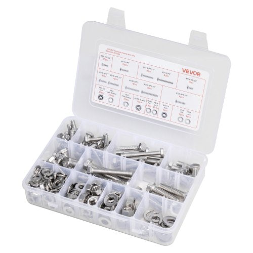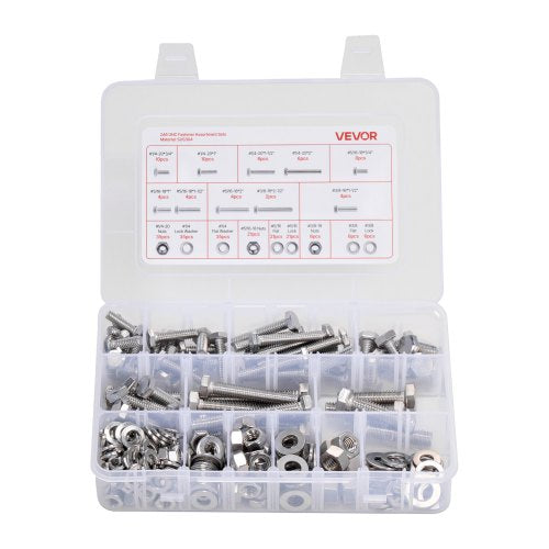 246-teiliges Set mit verschiedenen Spezifikationen: Dieses praktische Set aus Schrauben, Muttern und Unterlegscheiben umfasst 246 Zollschrauben, Muttern und Unterlegscheiben in den Größen #1/4-20, #5/16-18 und #3/8-16 (einschließlich Unterlegscheiben und Federscheiben in den Größen #1/4, #5/16, #3/8) in verschiedenen Längen. Ideal für allgemeine Reparaturen und Ersatzteile.