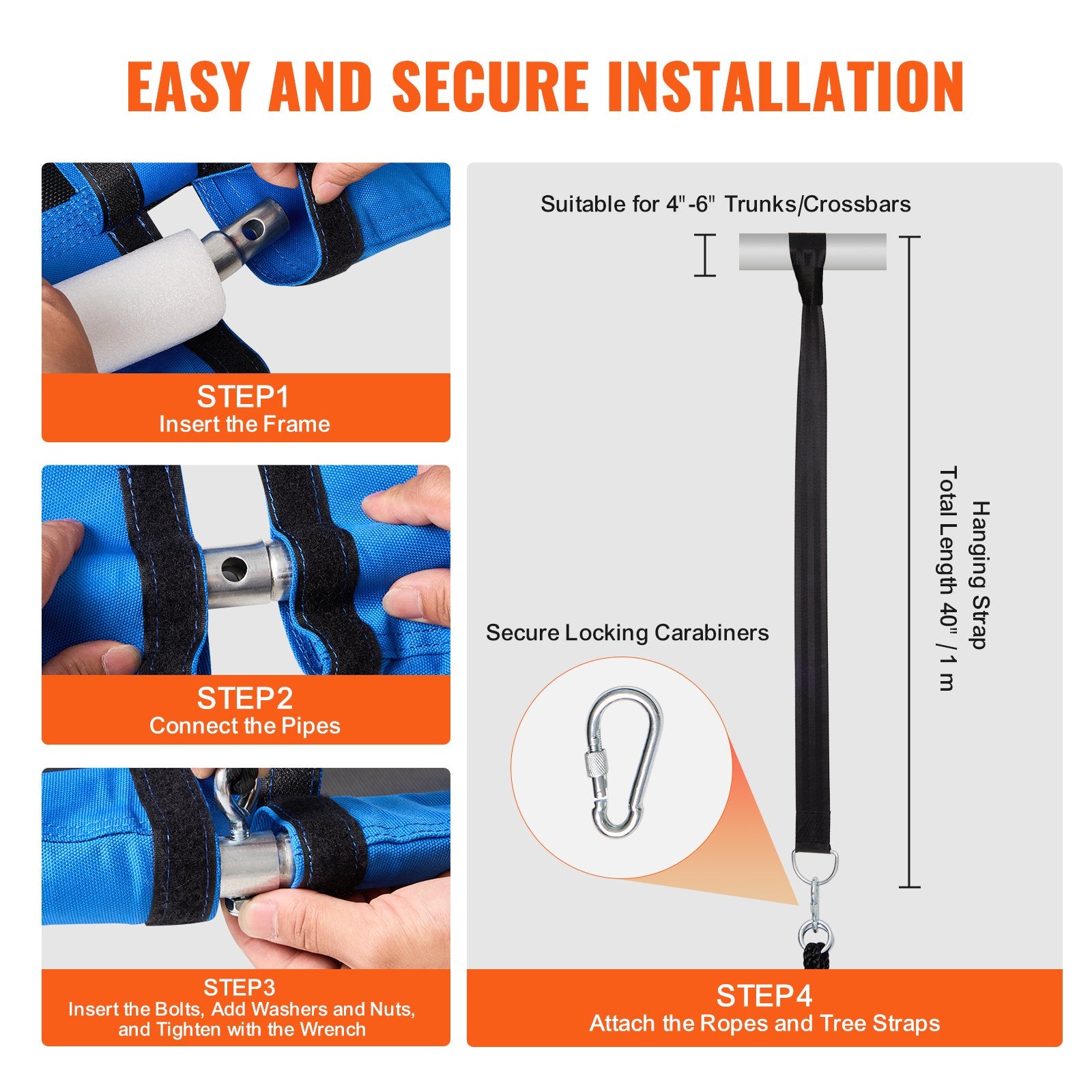 900D blaues Oxford-Gewebe: Die blaue Schaukel besteht aus 900D hochdichtem Nylongewebe. Dieses strapazierfähige Material ist robust und hält dem täglichen Gebrauch und der Beanspruchung im Freien stand. Es bietet eine lange Lebensdauer ohne Ausbleichen. Die Rahmenrohre bestehen aus verzinktem Stahl mit einer weichen Schaumstoffschicht und sorgen so für Komfort und Sicherheit für Kinder. Die Gewindeaufnahme für das Fass ist mit vier gleichmäßig belasteten verzinkten Stahlschrauben befestigt, die Rost widerstehen und die Schaukel stabil halten.