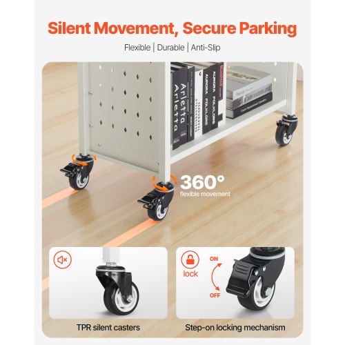 Leise Bewegung: Leise TPR-Rollen gleiten sanft, und zwei verfügen über eine Feststellfunktion für eine sichere Positionierung. Bewegen Sie den Bücherwagen problemlos über Holz- oder Fliesenböden, ohne jemanden zu stören – perfekt für Bibliotheken oder Nachtarbeit.