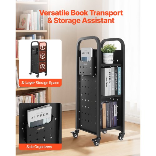 Extra große Kapazität: Dieser dreistöckige Bücherwagen mit 28 cm hohen Regalen bietet Platz für jede Menge Bücher oder Büromaterial! Er ist außerdem mit Seitenfächern für A4-Ordner/Tablets ausgestattet – perfekt für Bibliotheken, den Heimgebrauch und mehr.