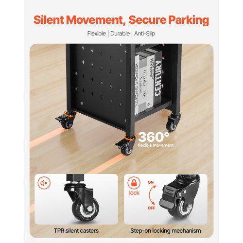 Leise Bewegung: Leise TPR-Rollen gleiten sanft, und zwei verfügen über eine Feststellfunktion für eine sichere Positionierung. Bewegen Sie den Bücherwagen problemlos über Holz- oder Fliesenböden, ohne jemanden zu stören – perfekt für Bibliotheken oder Nachtarbeit.