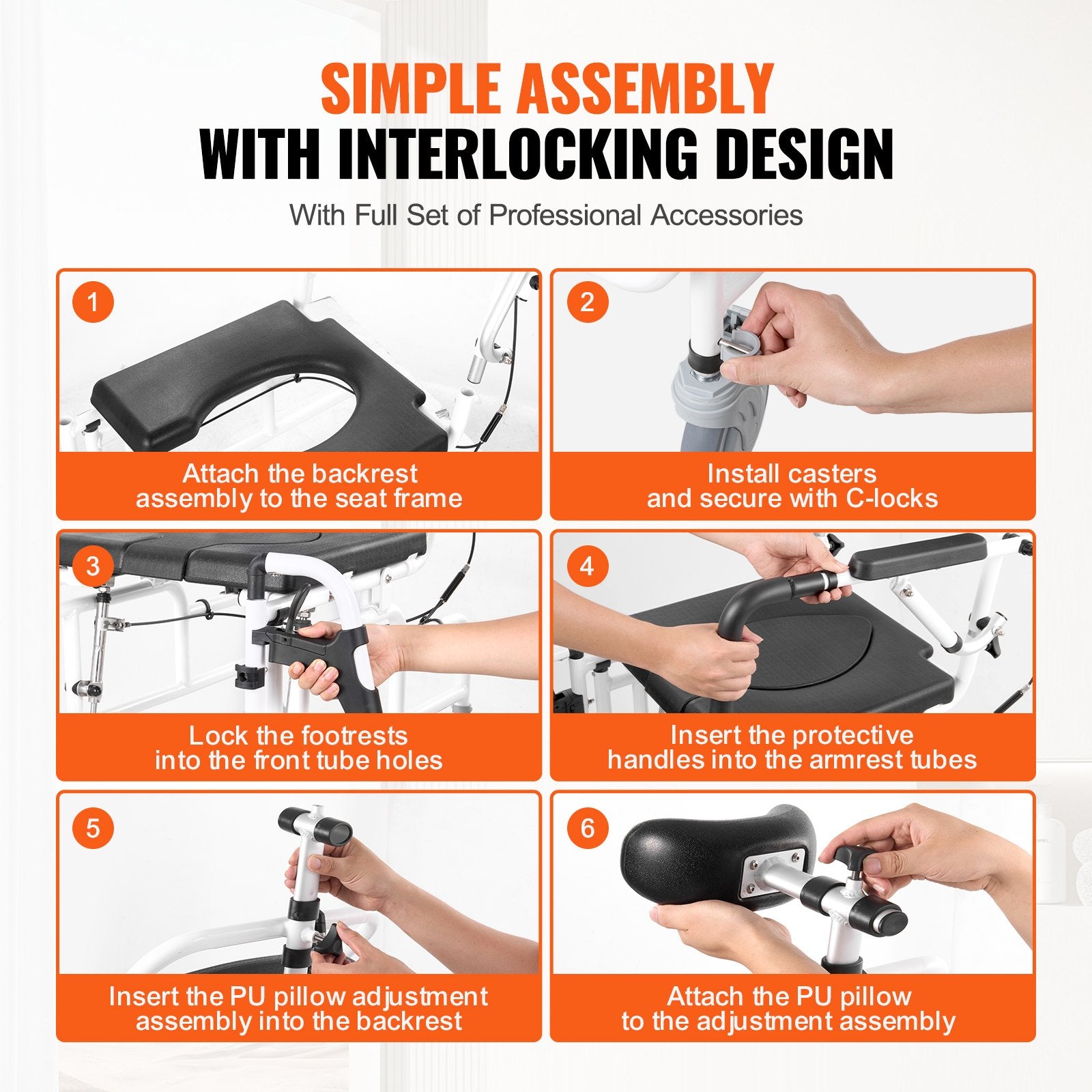 Hohe Flexibilität: Der Stuhl ist abnehmbar und klappbar, sodass Sie ihn an Ihre Bedürfnisse anpassen können. Die 5-Zoll-Rollen mit Bremse sorgen für sicheres Bewegen. Der einzigartige ausziehbare Nachtstuhl, die abnehmbaren, hochklappbaren Fußstützen und die hochklappbaren Armlehnen mit PU-Polsterung bieten Funktionalität und Komfort.