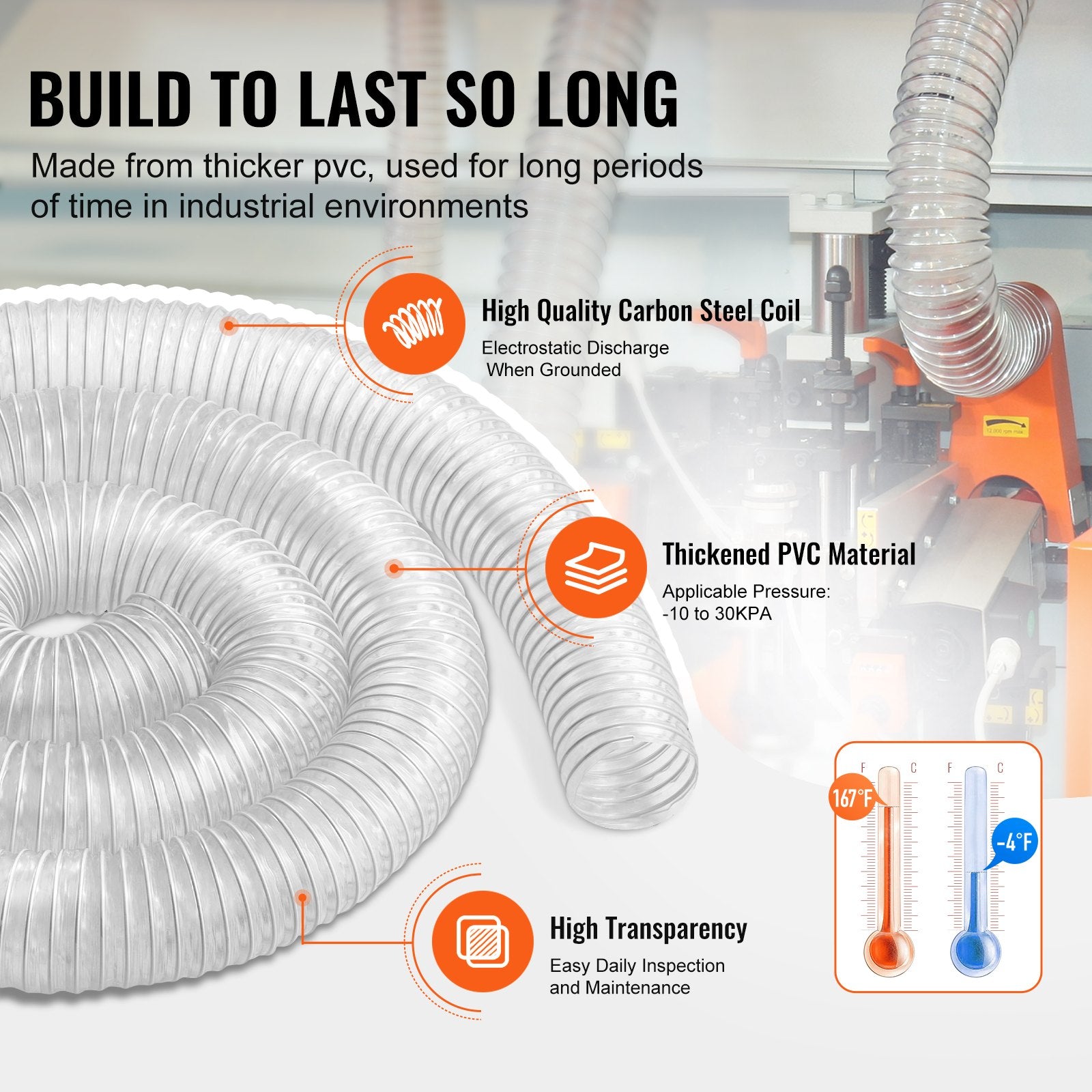 Zuverlässige und langlebige Materialien: Unser Staubschlauch besteht aus verdicktem PVC-Material und hochwertigen Stahldrahtspulen. Er hält Staub und Schmutz beim Schneiden, Fräsen oder Schleifen von Holz stand, ohne beschädigt zu werden. Die Kohlenstoffstahlspulen erhöhen die strukturelle Festigkeit und Stabilität des Schlauchs und verhindern, dass er während des Gebrauchs kollabiert oder sich verformt.
