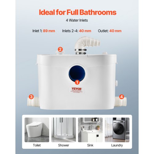 Eine Pumpe für alle: Diese Abwasserpumpe verfügt über vier Wassereinlässe (1 x 89 mm und 3 x 40 mm) und lässt sich problemlos an Waschbecken, Duschen und Badewannen anschließen, wodurch sie für verschiedene Badezimmerinstallationen geeignet ist.