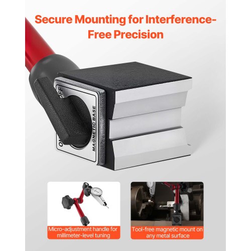 Stabilt stöd: Utrustad med ett mikrokuljusteringshandtag för millimeterfinjustering, fästs den magnetiska basen snabbt på metallytor. Idealisk med en mätklocka för exakta uppgifter som att upptäcka spill eller justering av spelrum