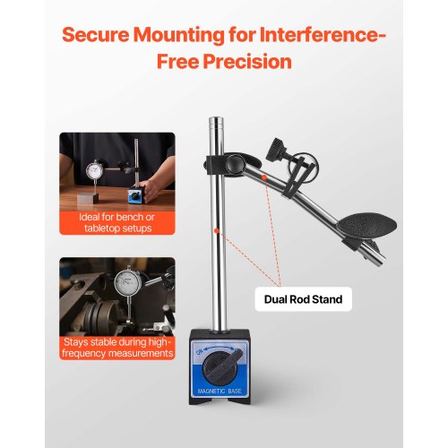 Stabilt stöd: Den dubbla stångstrukturen håller mätklockan stadigt på arbetsytan. Den hjälper till att bibehålla positionen under längre mätsessioner, vilket säkerställer noggranna resultat utan förskjutningar som kan påverka avläsningen.